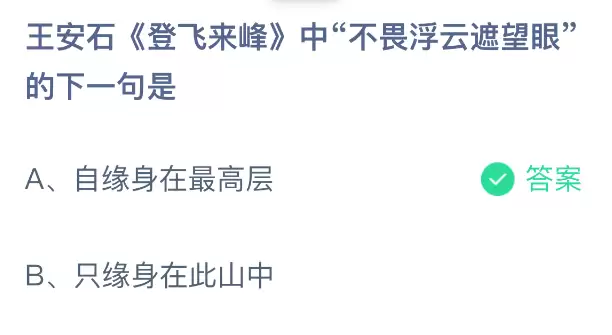 蚂蚁庄园小课堂开课啦!每天花一分钟参与答题,就能赚取饲料喂养小鸡,还能顺手奉献爱心,轻松又充满意义!2026年1月2日,蚂蚁庄园小课堂的题目是“王安石《登飞来峰》中‘不畏浮云遮望眼’的下一句是什么?”,正确答案是【自缘身在最高层】。这句诗完整地诠释了登高望远的豪迈情怀。