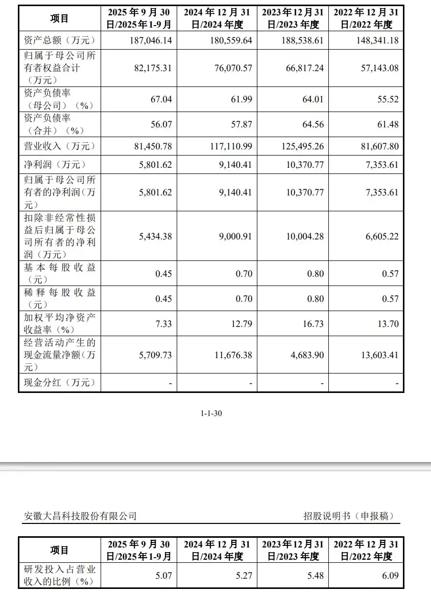 报告期内(2024年至2025年第三季度),大昌科技的营业收入分别为8.16亿元、12.55亿元、11.71亿元和8.15亿元;净利润则分别为7353.61万元、1.04亿元、9140.41万元和5801.62万元。