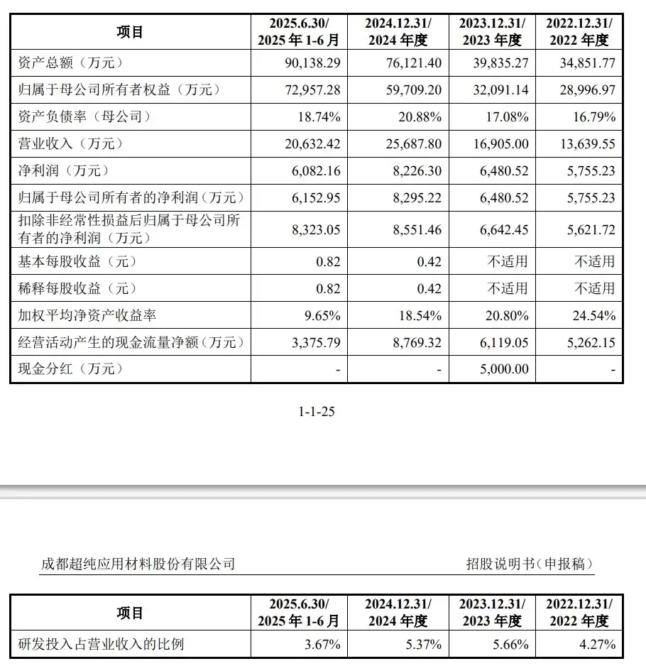 报告期内(2022年至2025年上半年),超纯股份的营业收入分别为1.36亿元、1.69亿元、2.57亿元和2.06亿元;净利润则分别为5755.23万元、6480.52万元、8226.3万元和6082.16万元。