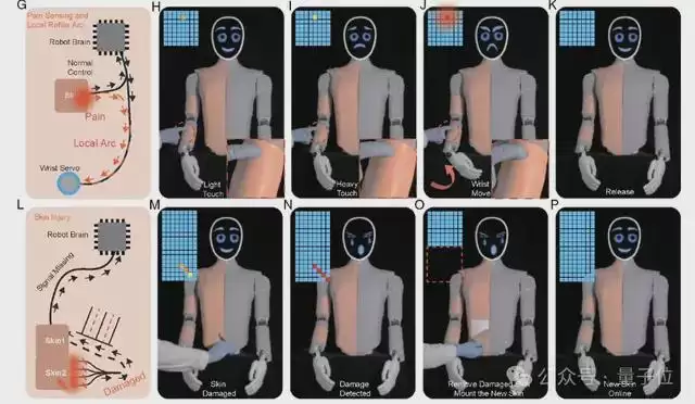 NRE-skin具备基于疼痛阈值触发的局部反射机制。电路层面的“疼痛中心”实时监测脉冲频率所反映的压力强度。