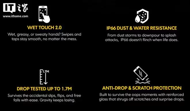 在耐用性设计方面,这款新机通过了严苛的MIL-STD-810H军用标准认证,能够耐受极端高温、灰尘、冲击以及“日常生活中的各种意外情况”。它同时具备IP66级别的防尘防水能力,并内置了湿手触控2.0技术,即使手指沾水也能正常操作屏幕。此外,手机还顺利通过了高达1.7米的跌落测试。