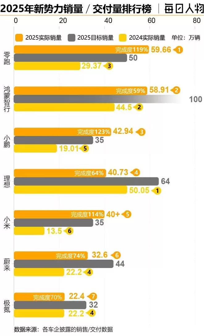 在两款热销车型的带动下,2025年蔚来累计交付326028台,创历史新高,同比增长46.9%。2025年12月交付量甚至突破4.8万台,彻底摆脱了“蔚一万”“蔚两万”的帽子。