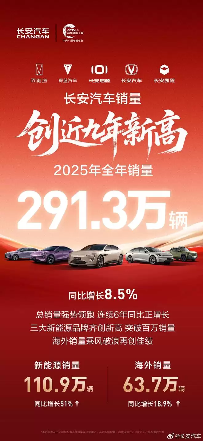 长安汽车2025年总销量291.3万辆,实现战略新高