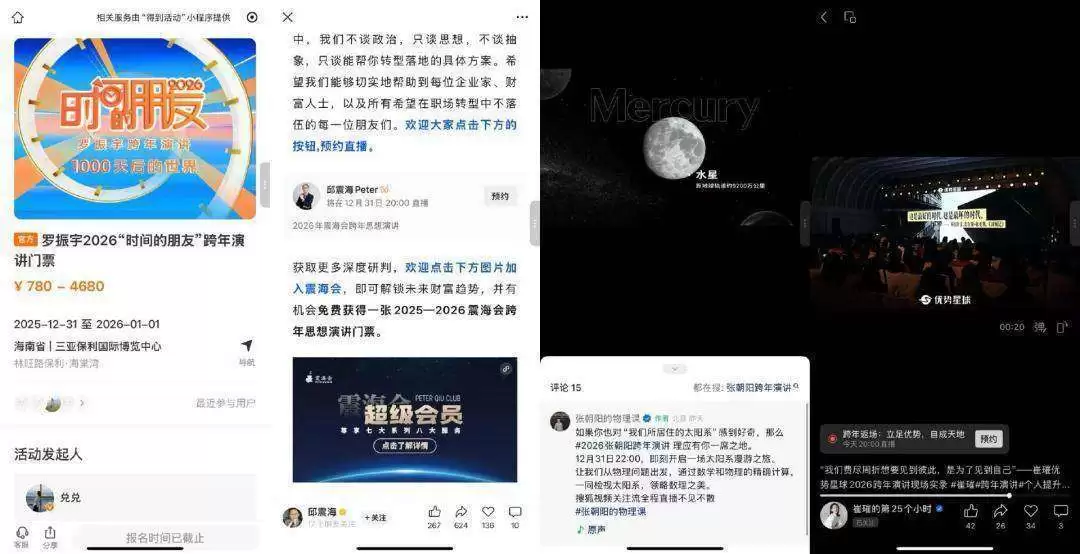 跨年演讲赛道近年竞争激烈,形式与内容争议不断。自2015年罗振宇开创知识跨年先河后,财经、互联网、物理、汽车等领域纷纷入局,话题覆盖职场、时政、科技等。罗振宇的“时间的朋友”已举办11届,门票价格从780元到4680元不等,2016年至2019年门票收入均超百万,赞助收入达千万级别。然而,近年上座率下滑、广告植入过多等问题逐渐显现,吴晓波的年终秀被指“广告泛滥”,部分门票在二手市场打折出售,热度明显消退。