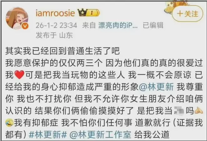 这里帮错过实时爆料的网友总结一波,网红司晓迪深夜爆料,晒出包括但不限于照片、视频、聊天记录等证据,暗示自己和多位男星有过亲密关系,牵扯男星包括但不限于林更新、范丞丞、蔡徐坤、鹿晗、李汶翰、檀健次、周奇、吴某凡、张一山、屈楚萧、黄明昊、张远等等等等。