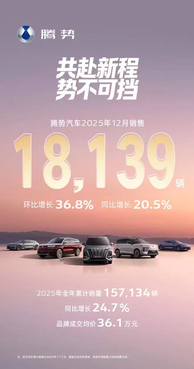 2025年12月,腾势单月销量18139辆,环比增长36.8%,同比增长20.5%;全年累计销量157134辆,同比增长24.7%;更值得注意的是,品牌全年成交均价维持在36.1万元的高位区间。