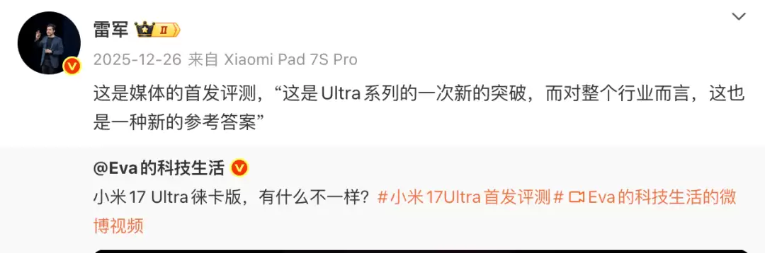 此前,小米创始人雷军曾在社交媒体转发该机型的评测视频,称其“为Ultra系列树立新标杆,为行业提供全新解题思路”。这款搭载徕卡联合调校影像系统的旗舰机,自发布以来持续引发市场关注,其6000元以上的定价策略被视为小米冲击高端市场的关键布局。