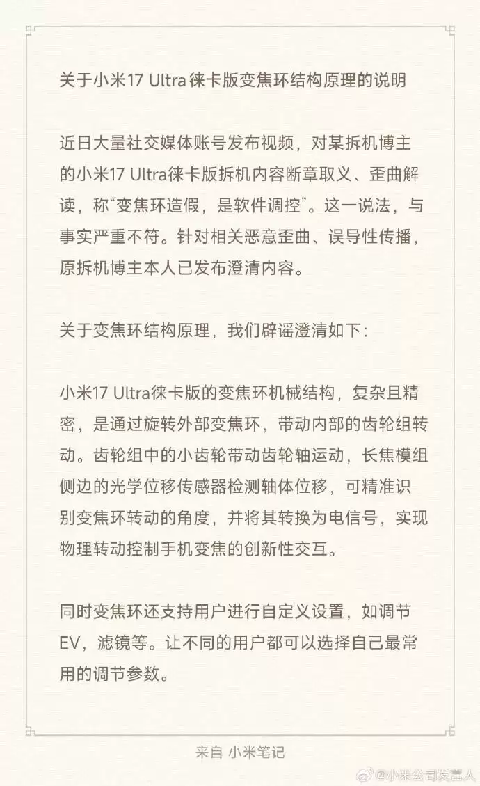 小米17 Ultra 底卡版变焦环“造假”争议全解析:复杂机械结构真相