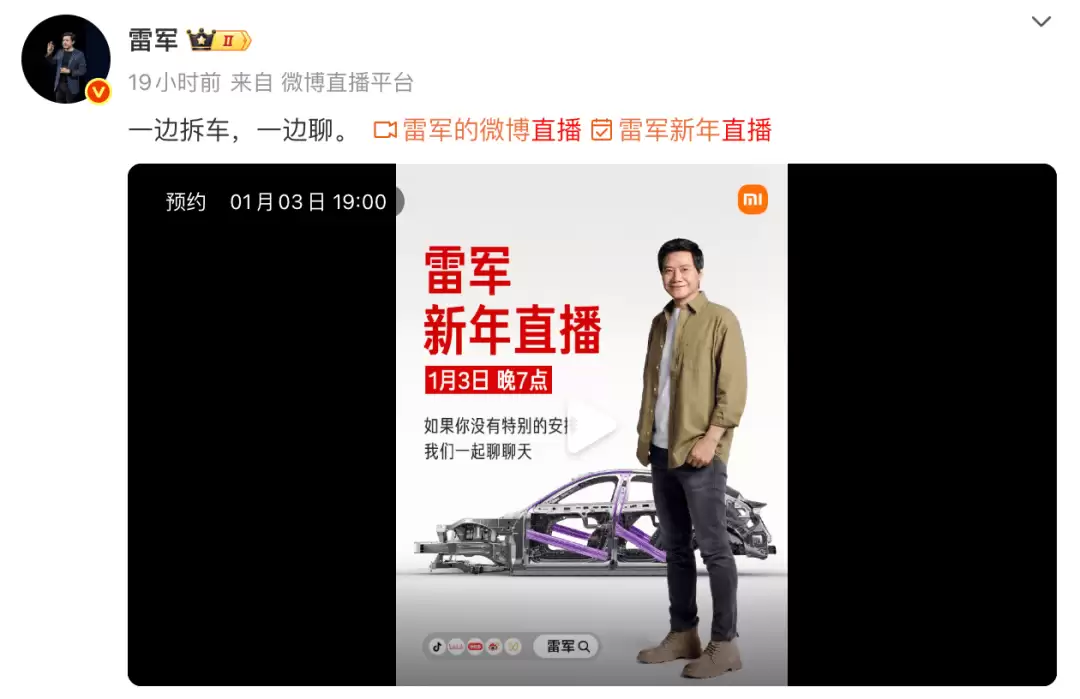 原定于2025年末举办的雷军跨年直播,因创始人感冒推迟至1月3日晚上。据内部人士透露,直播中将首次公开拆解小米YU7工程样车,技术团队将现场演示电池包防护结构、智能驾驶硬件布局等核心设计。这场持续三小时的技术解析会,还将设置观众互动环节,解答关于小米汽车技术的疑问。