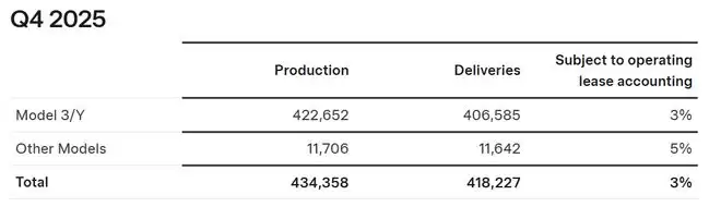 近日,特斯拉发布了 2025 年第四季度(Q4)产量和交付数据,远低于市场和分析师的预期。特斯拉公开数据显示,该公司 2025 年第四季度总交付量 418,227 辆,同比下降 15.6%,第四季度总产量 434,358 辆,同比下降 5.5%。