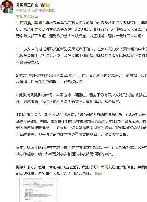 紧接着,范丞丞工作室也发布声明,指出所谓亲密合照来自多年前多人聚会的公开场景,属于正常社交合影,并强调将追究造谣者责任。