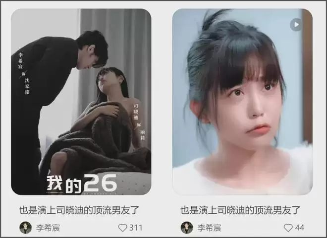 司晓迪还出演过辛雨锡的短剧,就是饰演顶流男主的出轨对象,在司晓迪的表演片段被扒出来之后,短剧男主李希宸连发两条动态,这热度也是让他蹭明白了。