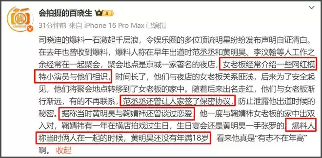 2026开年瓜的劲儿也太大了!网红司晓迪自曝和十多位男星都有联系,不是一起吃过饭喝过酒,就是一起躺过床,虽然后续大部分男星都发布声明回应,但司晓迪仍在持续爆照。