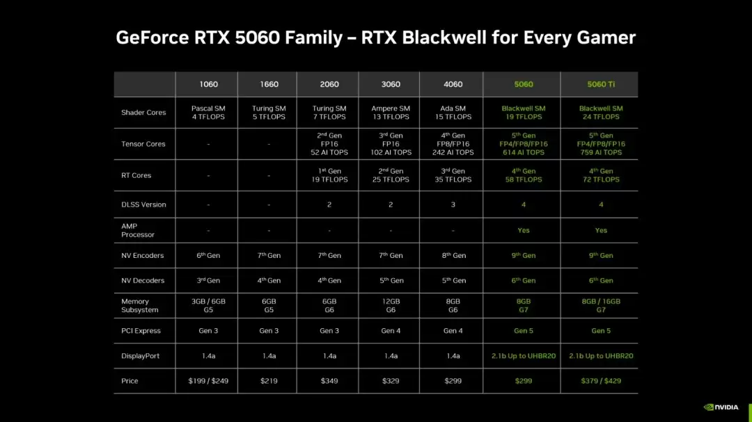 NVIDIA表示,RTX 5060系列显卡采用了与50系其他GPU相同的硬件创新,借助最新的Shader Core、Tensor Core、Ray Tracing Core以及高速的GDDR7显存,旨在为用户提供出色的游戏体验。