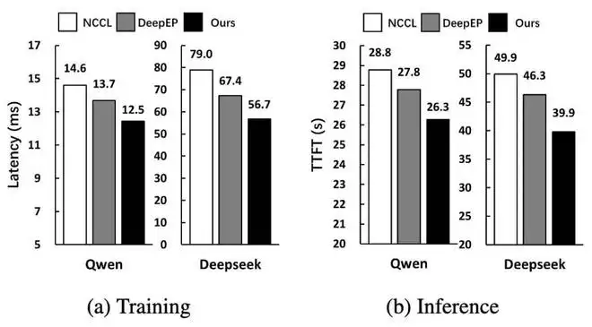 在全模型训练和推理中,FUSCO 同样展现出明显优势。我们在 64 张 GPU 上对 Qwen3-235B-A22B 和 DeepSeek-V3 两种代表性 MoE 模型进行了评测,涵盖模型单轮训练时间和推理首 token 响应时间。
