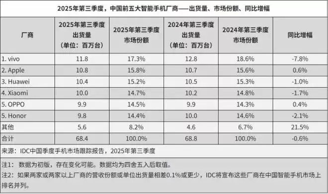 IDC最新数据显示,2025年三季度,中国智能手机出货量约6840万台,同比下降0.6%,连续六个季度保持负增长或零增长态势。