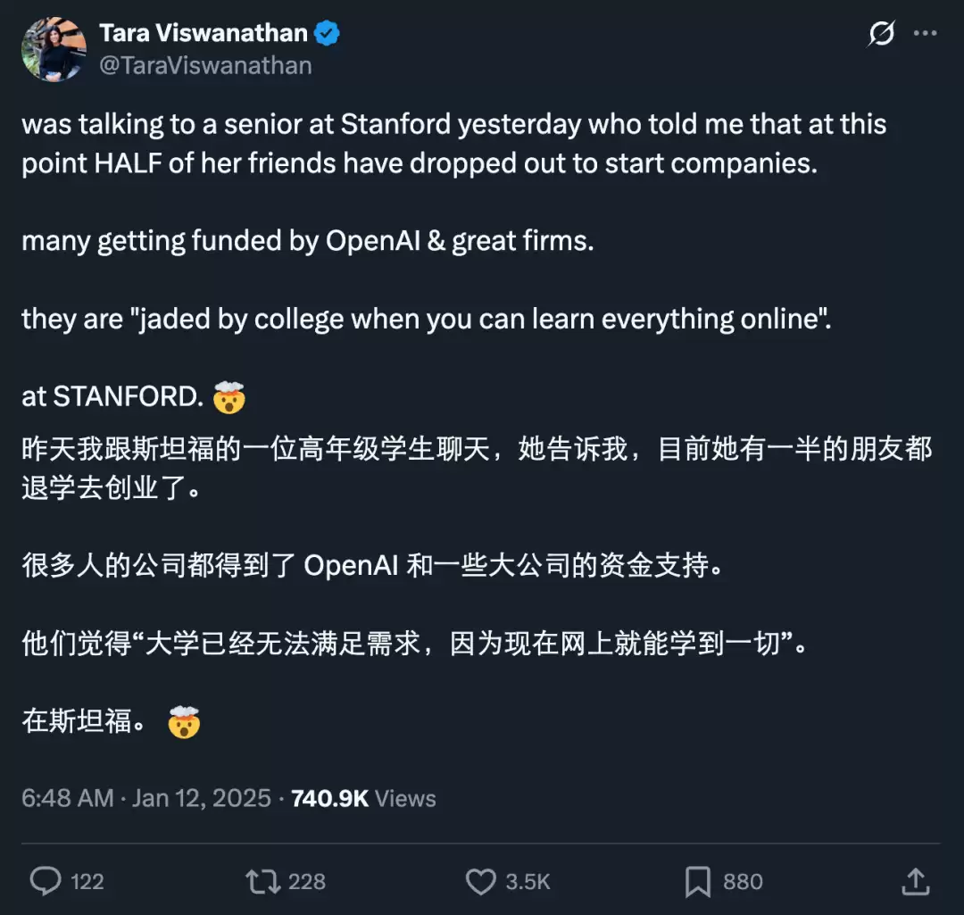 Moxxie Ventures 创始合伙人 Katie Jacobs Stanton 指出:“据我所知,Y Combinator 其实并未系统性追踪辍学数据,但如果我们观察近几期学员的情况,会发现一个明显的趋势——越来越多的创业者主动强调自己从大学、研究院甚至高中阶段辍学的经历。