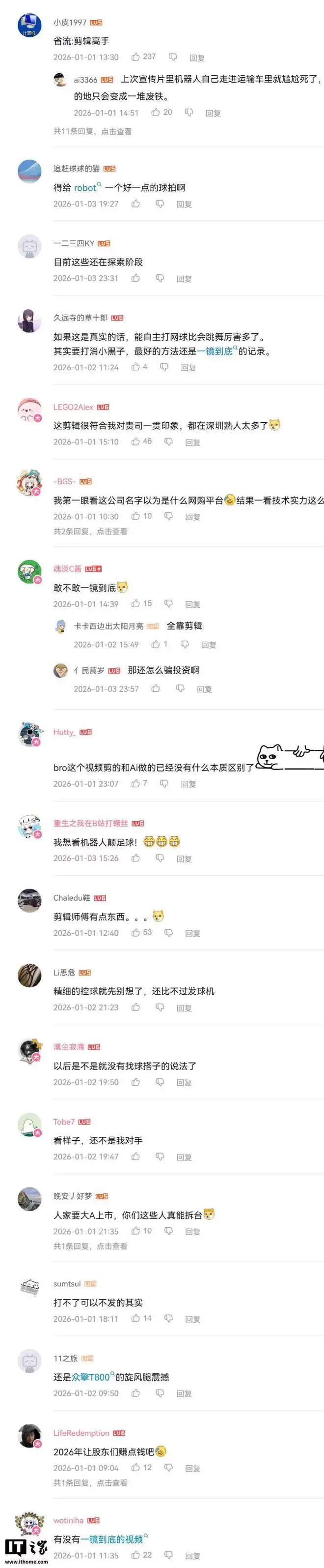然而,B站视频下方的评论区对这一成果反响不一,不少网友质疑视频存在动作剪辑的痕迹。一条热门评论直接称其为“剪辑高手”,还有人希望优必选能公布一段一镜到底、未经剪辑的机器人打网球实拍视频。