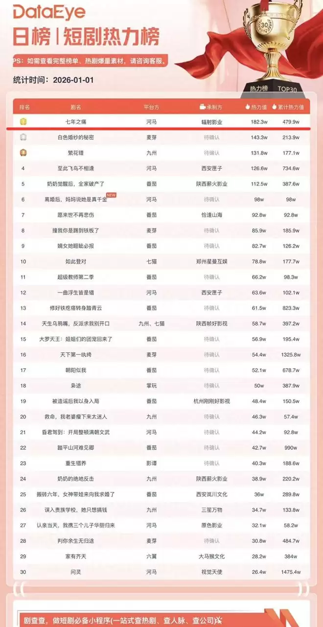 继去年国庆档的《家庭煮夫》之后,何必导演的短剧《七年之痛》再次登顶2026年元旦档短剧热榜,成为开年爆款。