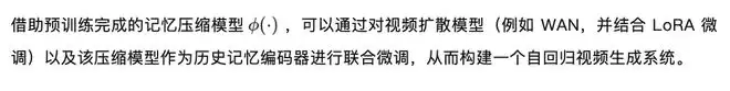 这种预训练模型可以直接微调为自回归视频模型的记忆编码器(memory encoder),从而以较低的上下文成本实现长历史记忆建模,并且仅带来相对较小的保真度损失。