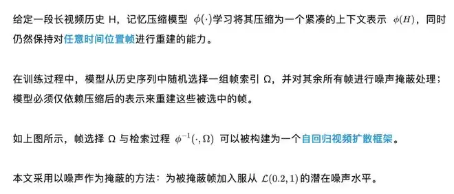 由此得到的视频生成模型具备超长历史窗口(例如超过 20 秒)、极短的历史上下文长度(例如约 5k),并且对帧检索质量进行了显式优化。