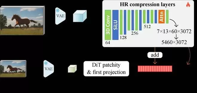在网络结构设计上,提出了一种轻量级双路径架构:模型同时处理低分辨率视频流和高分辨率残差信息流,并通过将高分辨率特征直接注入 Diffusion Transformer 的内部通道,绕过传统 VAE 所带来的信息瓶颈,从而进一步提升细节保真度。