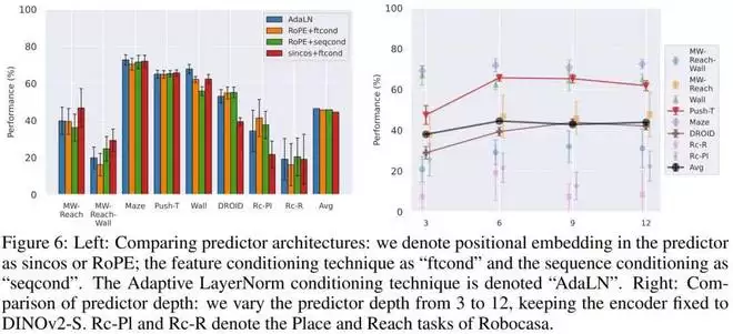 研究最终汇总所有洞察,提出了针对不同任务的最优配置:在模拟器中使用 ViT-S 配以 AdaLN,而在真实复杂场景中使用 DINOv3 ViT-L 配以 12 层深度的预测器。