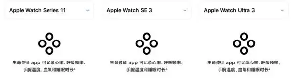 目前,所有在售的最新款Apple Watch均支持生命体征App,其中Apple Watch SE3受限于传感器,无法记录血氧信息,但也支持记录心率、呼吸频率、手腕温度和睡眠时长。可以说这项对用户健康至关重要的功能,已经覆盖了当前绝大多数Apple Watch用户。