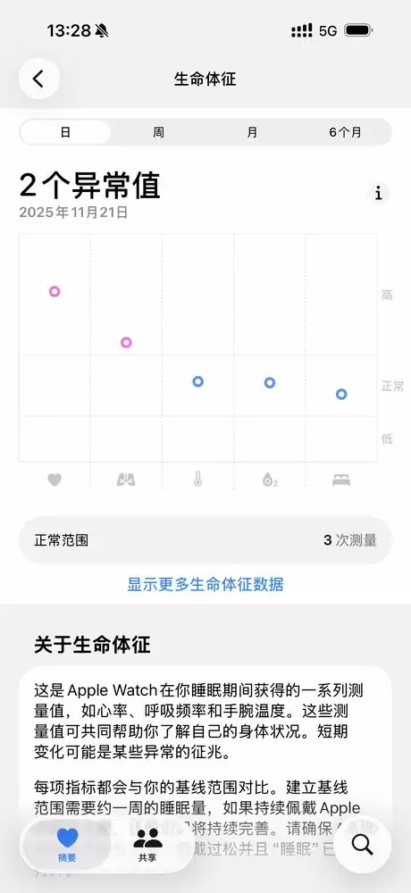 现在的医学共识是,生理数据的改变往往早于主观症状的感觉。而“生命体征”可以通过夜晚的监测,建立起用户专属的生理模型。当Apple Watch捕捉到了手腕上的异常数据信息,也代表着身体的健康状况需要用户关注。