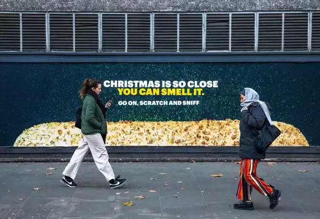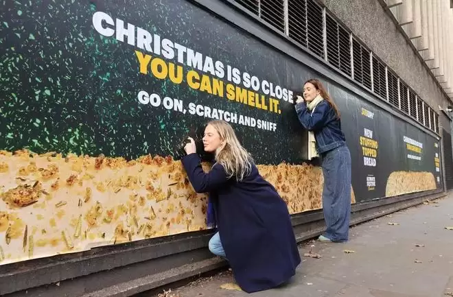 以快餐品牌赛百味Subway为例,其在伦敦市中心投放了一块长约15米的"刮刮闻"广告牌,该装置以品牌新推出的鼠尾草洋葱馅面包为灵感,通过实验室调配分子香氛,并将其微胶囊化后覆于广告表面。路人经过时,不仅能看到放大的面包视觉,还能闻到接近真实烘焙的气味。