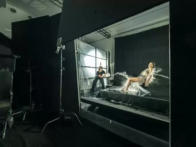 Sølve Sundsbø回忆道:"创作初期,我们会问,‘风应该怎么呈现?’风是无形的,唯有通过物体的被吹拂才能显形。水是包覆,也是冲击。我不希望它们只是背景,而是成为人物身体与情感的一部分。"因此,倍耐力年历并未采用户外实景,而是在摄影棚内精准设计每一个元素与灯光条件,确保人物在其中既保持美感,也真实可感。