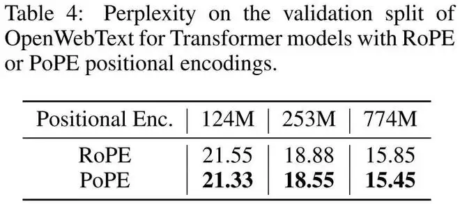 结果来看 ,在所有规模下,PoPE 的困惑度均始终低于 RoPE。