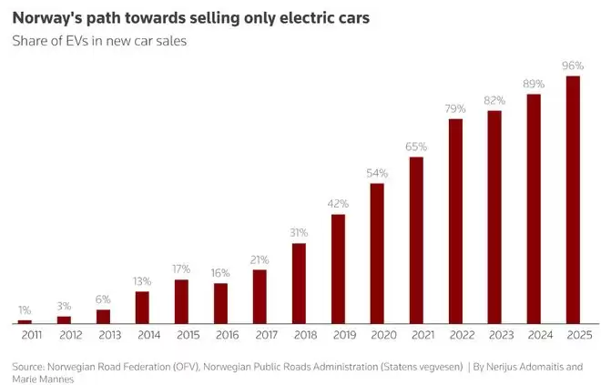 (文/观察者网 张家栋 编辑/高莘)挪威道路联合会(OFV)日前发布数据显示,2025年挪威新注册汽车几乎全部为纯电动车,全年电动车渗透率达到95.9%,12月更是接近98%,显著高于2024年的88.9%。在全球主要汽车市场电动化进程分化的背景下,挪威继续巩固其在淘汰燃油车方面的领先地位,而中国制造电动车在这一高度成熟市场中的存在感正持续增强。