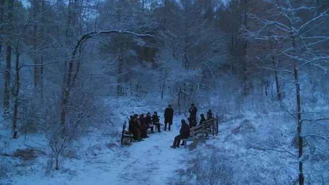 二舅走后,根据他的遗愿,他的骨灰被撒在了妻子李小珍撒的那棵树下。又是一个冬天,皑皑白雪覆盖了整片森林,树梢上的贝壳风铃吹动,老舅的朋友来到了这里。