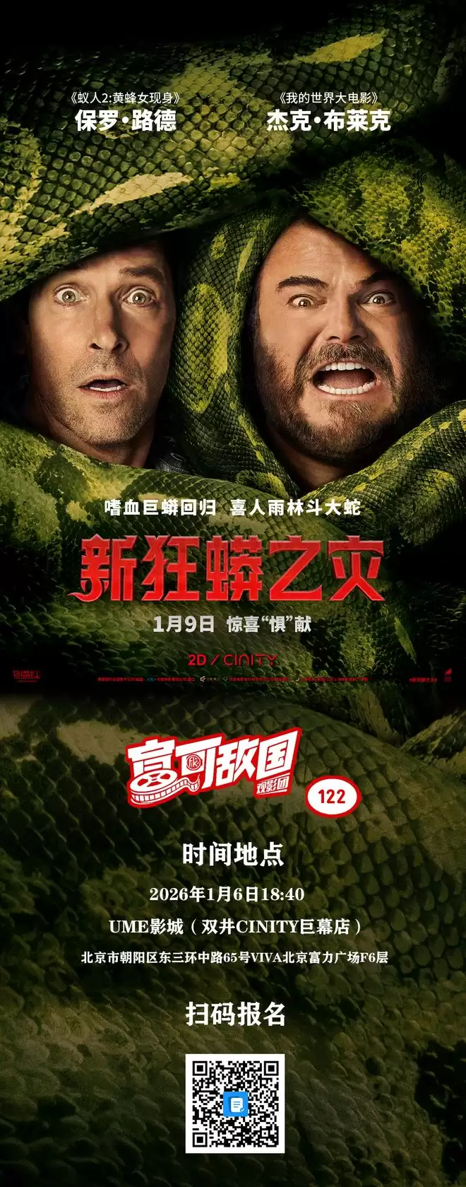 这帮老友将经历怎样的惊心动魄?整部电影究竟有多蛇精病?《新狂蟒之灾》将于1月9日公映。北京的朋友们有福了,咱们将提前于1月6日(周二)看到这部电影,映后将有有趣互动环节等着你哦!欢迎大家呼朋唤友一起来玩!