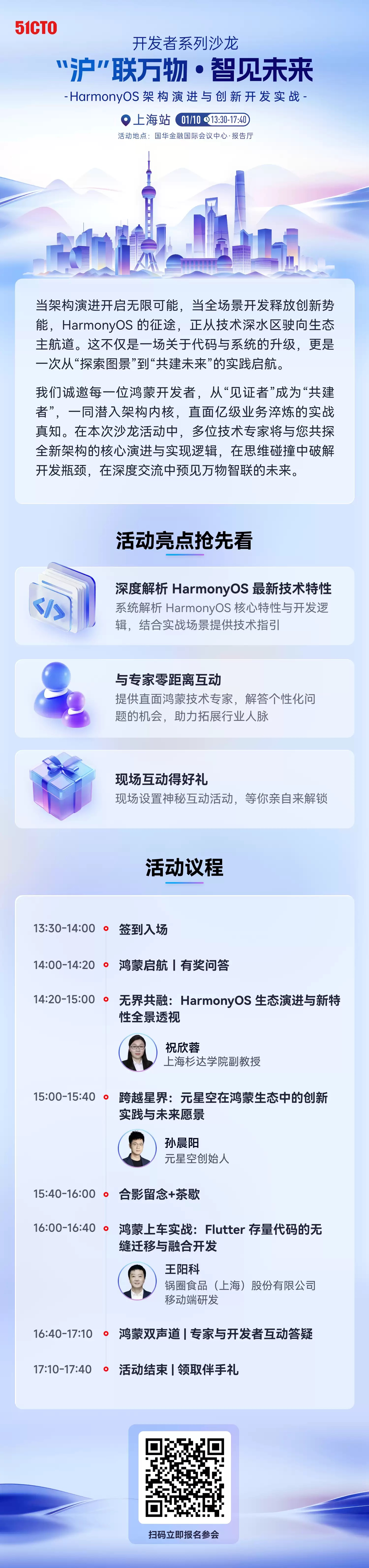 2026年1月10日13:30,以“‘沪’联万物·智见未来——HarmonyOS架构演进与创新开发实战”为主题的开发者系列沙龙即将在上海启幕。