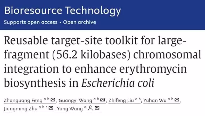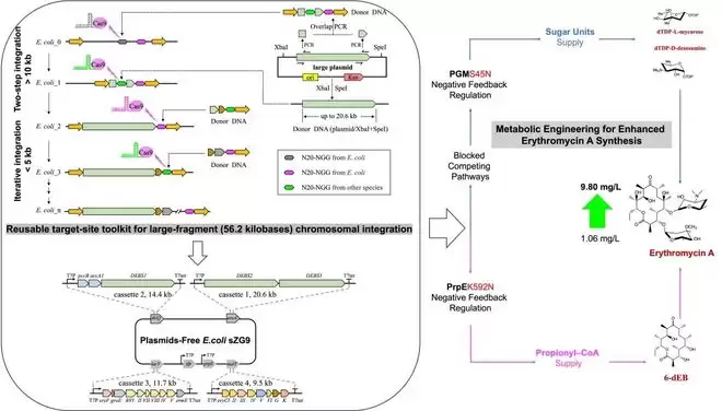 借助这项技术,研究人员将23个与红霉素合成相关的基因(总长达到56.2 kb)精准集成到大肠杆菌BAP1的染色质上,获得了工程菌株sZG9。这也是全球首个实现无质粒红霉素A生物合成的大肠杆菌菌株。