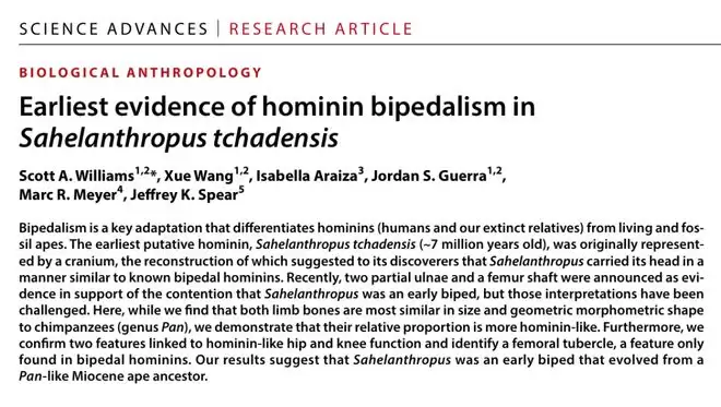 1 月 2 日,纽约大学人类起源研究中心在权威期刊 Science Advances 发表了一项最新成果。由斯科特·威廉姆斯(Scott A. Williams)教授带领的团队,利用高精度技术分析了出土于中非乍得的关键化石,确证了生活在约 700 万年前的乍得沙赫人(Sahelanthropus tchadensis)已具备直立行走的能力。