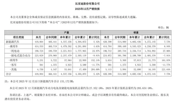 新年伊始,比亚迪在1月4日公布了2025年12月的产销快报。数据显示,2025年12月,公司新能源汽车产量为41.98万辆,去年同期为46.64万辆;当月销量为42.04万辆,去年同期的销量为51.48万辆。回顾整个2025年,比亚迪累计产量达453.74万辆,相比去年同期增长5.42%;累计销量则为460.24万辆,累计同比增长7.73%。在出口方面,12月新能源汽车出口13.32万辆。此外,12月新能源汽车动力电池及储能电池装机总量约为27.352GWh,而2025年全年累计装机总量已达到285.634GWh。