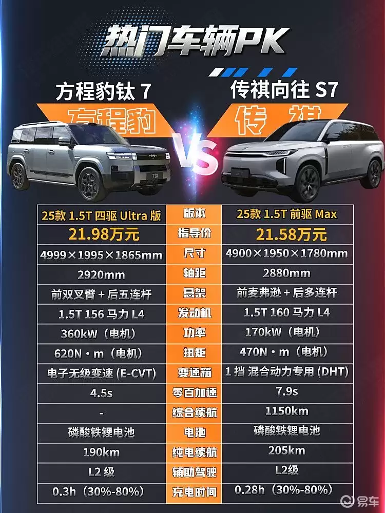在新能源大型SUV领域,方程豹豹7与传祺享往S7凭借各自的技术亮点和产品定位,成为了消费者关注的焦点。两款车型都以21万元级的价格切入市场,却在设计风格、动力配置与智能化体验上展现出差异化竞争态势,为家庭用户提供了多元化的选择空间。