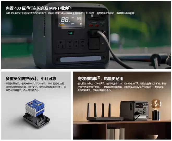 从商品详情页了解到,这款电源以接近半度电的紧凑机身,容纳了高达1度电(1008瓦时)的电池容量。其内部集成400瓦行车闪充接口,可直接连接汽车电瓶进行补电,还配备了400瓦MPPT太阳能充电模块,方便连接太阳能板高效充电。无论是自驾旅行、户外露营,还是应对临时停电等突发情况,它都能随时随地提供稳定可靠的电能支持。