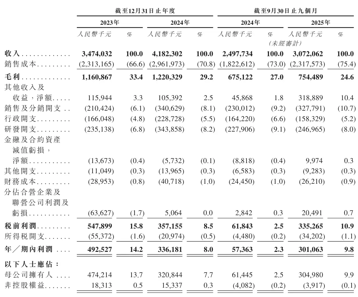 星星充电成立于2014年,是一家专注于智能充电设备供应的企业。招股书披露的数据显示,公司在2023年及2024年的营业收入分别为34.74亿元和41.82亿元;同期毛利润分别为11.61亿元和12.2亿元;毛利率分别为33.4%和29.2%;期内利润分别为4.93亿元和3.36亿元;同期利润率分别为14.2%和8%。