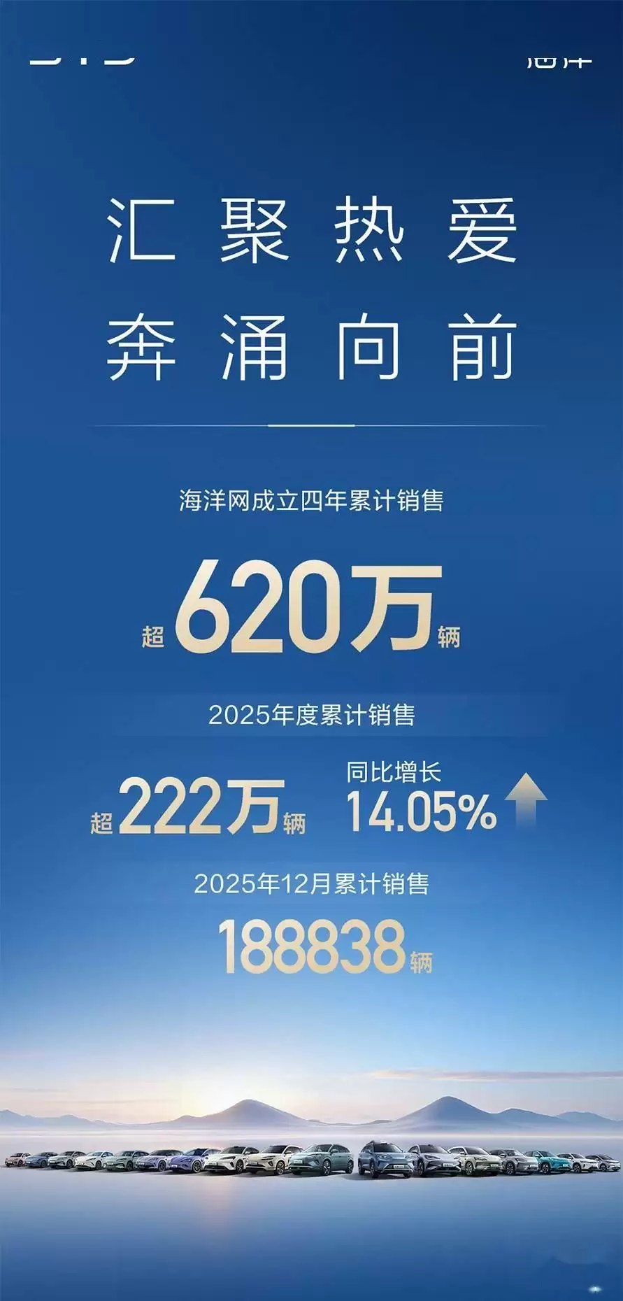 比亚迪汽车最新公布的销售数据令人瞩目,其海洋网车型持续领跑市场。成立短短四年间,海洋网累计销量已突破620万辆,成为品牌增长的重要引擎。2025年,该系列车型年度累计销量达222万辆,较上一年度增长14.05%,其中12月单月销量为188,838辆,展现出强劲的市场竞争力。
