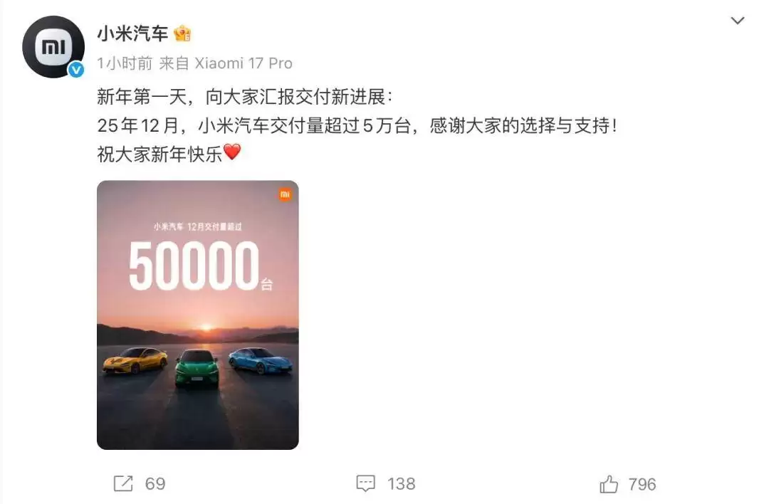 小米汽车2025年业绩亮眼:提前达标,12月销量再创新高
