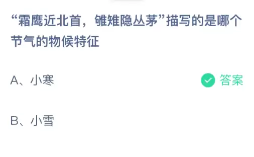 霜鹰近北首,鹖鴠隐丛茅描写的是哪个节气的物候特征?支付宝小鸡课堂开课啦!每天花一分钟答题赚饲料,喂喂小鸡就能贡献爱心啦!轻松又意义十足!2026年1月5日蚂蚁庄园的小鸡课堂题目正确答案是【小寒】, 霜鹰近北首,鹖鴠隐丛茅描写的是【小寒】节气的物候特征。