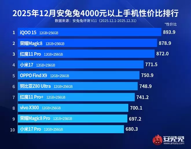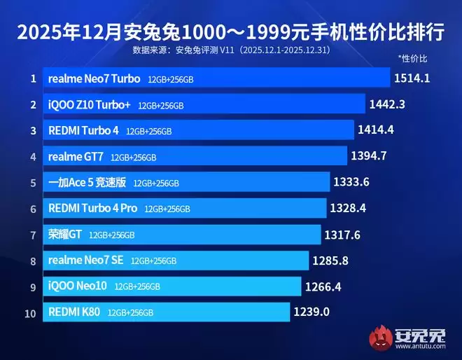 谁都希望花更少的钱买到更好的产品,这种消费心理在智能手机领域同样存在,而这也恰恰是"性价比"概念的由来。今天要为大家盘点的是安兔兔发布的2025年12月各档位机型性价比榜单。
