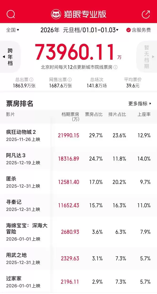 元旦档总票房7.39亿,其实整体票房表现尚可。