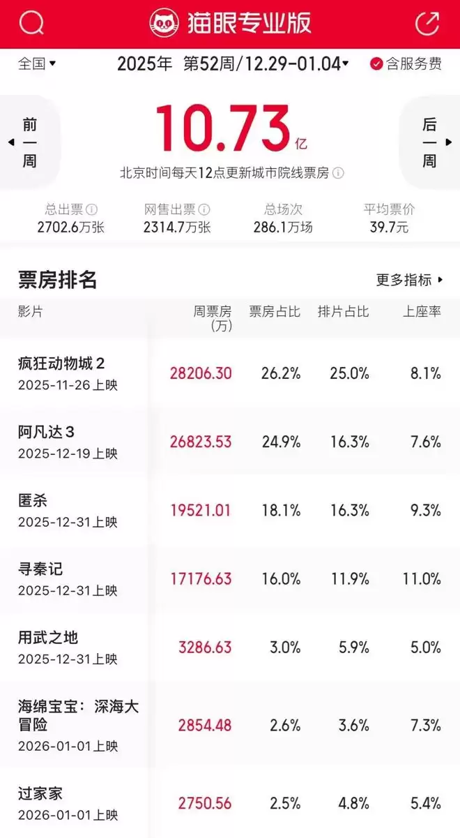 另外,由于有元旦档的原因,上周内地总票房表现还是很不错的。上周内地票房顺利突破10亿,为10.73亿。