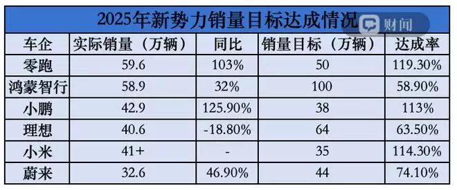 蔚来则是2025年销量最少的车企,为32.6万辆,距离全年44万辆的销量目标达成率为74.1%。