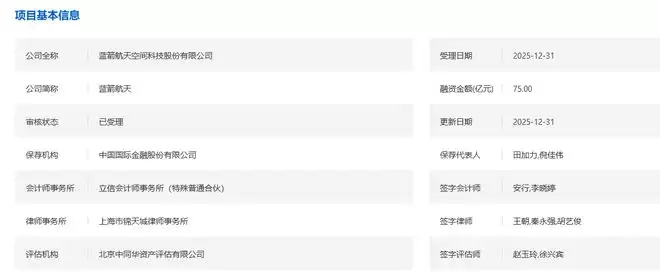 近期,上交所正式披露,蓝箭航天空间科技股份有限公司科创板IPO审核状态已更新为“已受理”,公司拟募集资金总额75亿元。